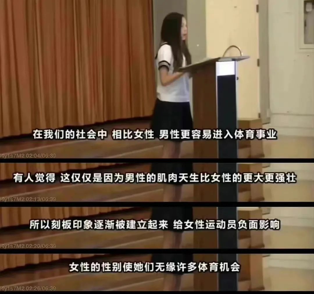在那次演讲中,她如此描述这种不平等:‘在当今世界,男性比女性更有机会去参与运动相关的职业,许多人认为,这仅仅是因为男性的肌肉天生比女生的肌肉更大、更强,所以随着时间的推移,刻板印象逐渐发展成对女性运动员的负面定义,女性经常因为性别,而被剥夺合适的运动机会。’