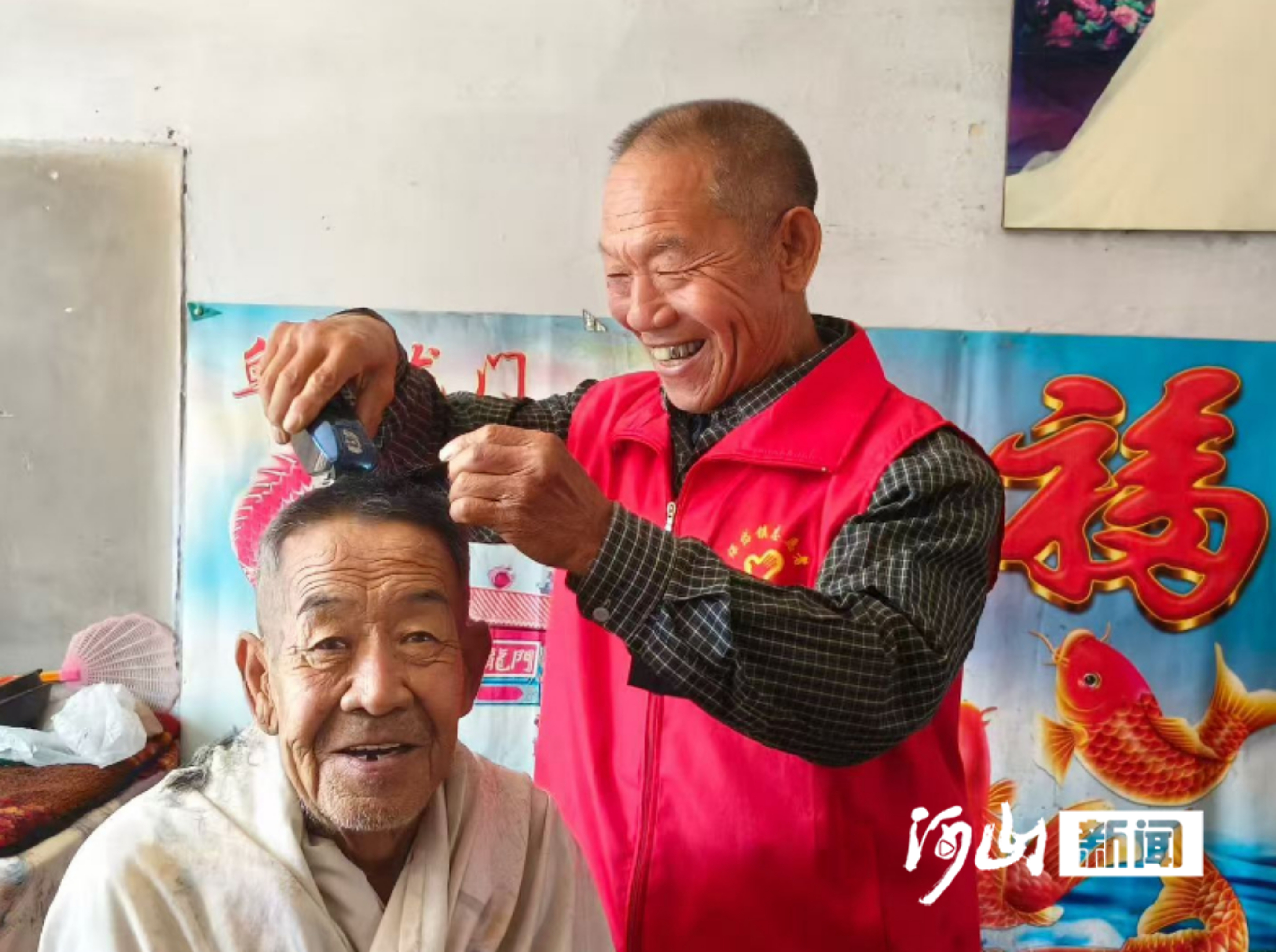 10月6日中午,涿鹿县保岱镇下葫芦村,77岁的理发志愿者郭伟仁为村民义务理发。 张彩红 摄