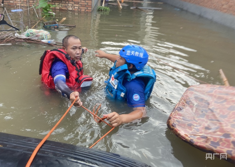 晁金军(左一)参与洪水救援(央广网发 受访者供图)