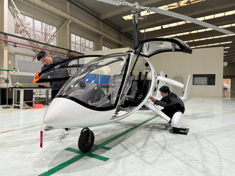 工作人员对自转旋翼机进行组装(央广网发 王娟 摄)
