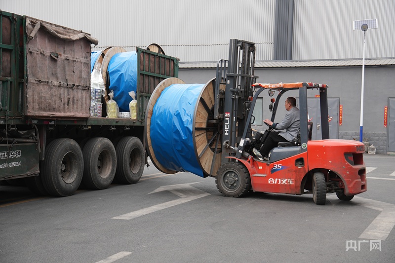 订单不断,工作人员将电缆装车发货(央广网记者 王艺霖 摄)