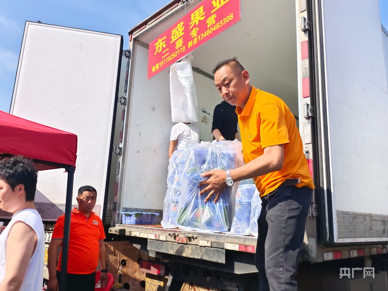 王慧杰正在将荔枝卸车,供客商挑选 (央广网记者 王艺霖 摄)