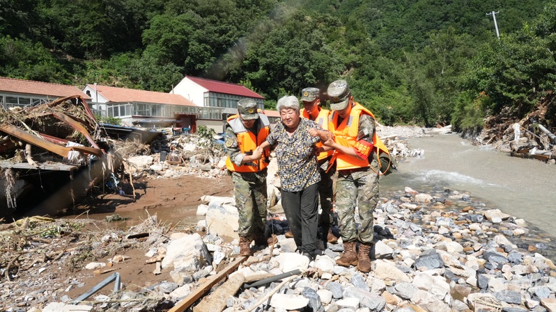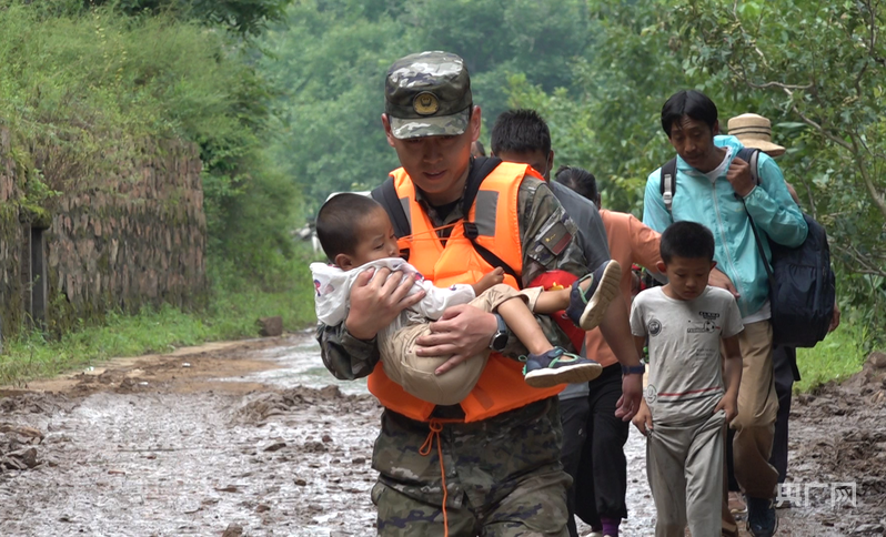 “孩子别怕,叔叔抱你下山。”在转移受困群众时,下山道路碎石泥泞,武警承德支队战士徐军剑一路小心翼翼地护送幼童下山。