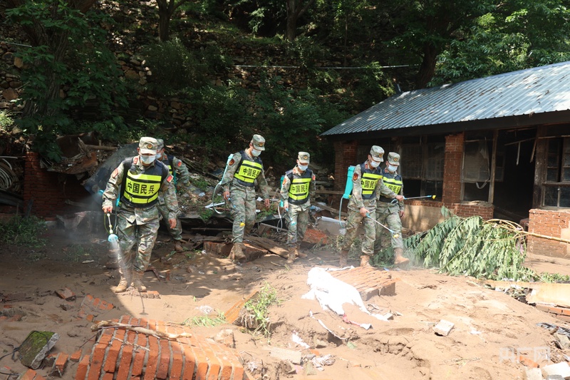 承德兴隆县民兵应急连100余名民兵携带装备器材徒步6公里,深入2个行政村,6个自然村配合开展道路维护、群众转移等工作。针对受灾较为严重的朱家沟村,河北省军区组织民兵力量全面开展防疫消杀工作。