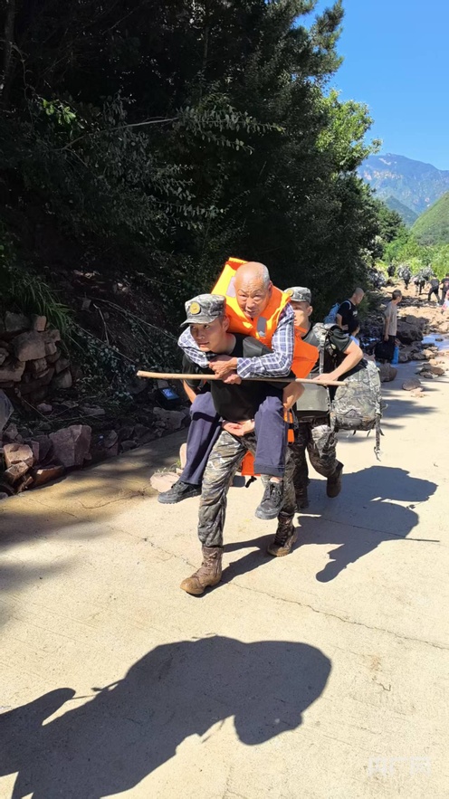 武警战士秦永盛背着老人转移(央广网发 姚鹏杰 摄)