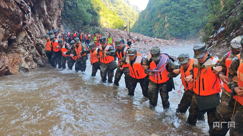 武警官兵手挽手渡过急流(央广网发 姚鹏杰 摄)