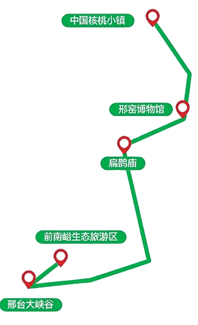 线路:中国核桃小镇—崆山白云洞—邢窑博物馆—扁鹊庙—邢台大峡谷—英谈村—抗大陈列馆—前南峪生态旅游区