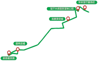 线路:怀来官厅服务区—官厅水库国家湿地公园—涿鹿黄帝城—蔚县暖泉镇—蔚州古城