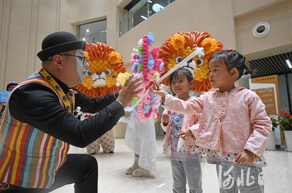 10月1日,第二十届中国吴桥国际杂技艺术节B场比赛前,小丑演员在场外与小朋友互动。河北日报记者 张昊摄
