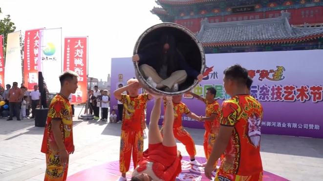 在朗吟楼广场,杂技、街舞、舞龙等节目轮番上演,让游客在双节期间感受传统文化与现代活力的碰撞。吴桥杂技的经典传统项目“脚蹬大缸”最受瞩目,现场观众有机会参与其中,感受这项绝活的独特魅力。