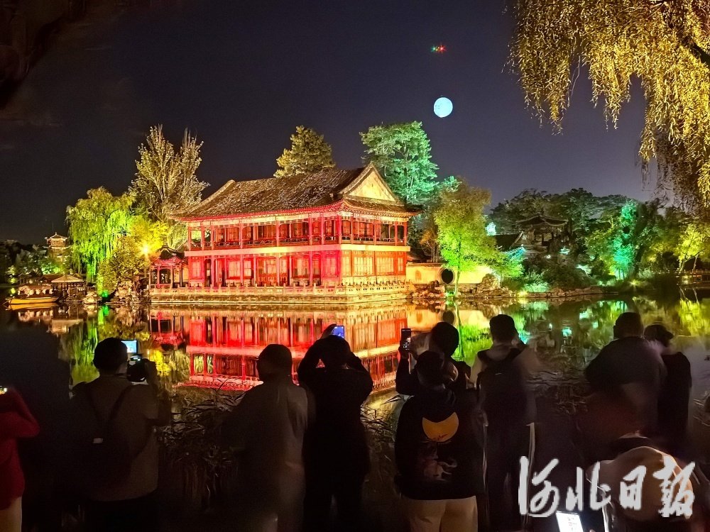 10月6日,流光溢彩的避暑山庄烟雨楼吸引众多游客驻足拍照。河北日报记者陈宝云摄