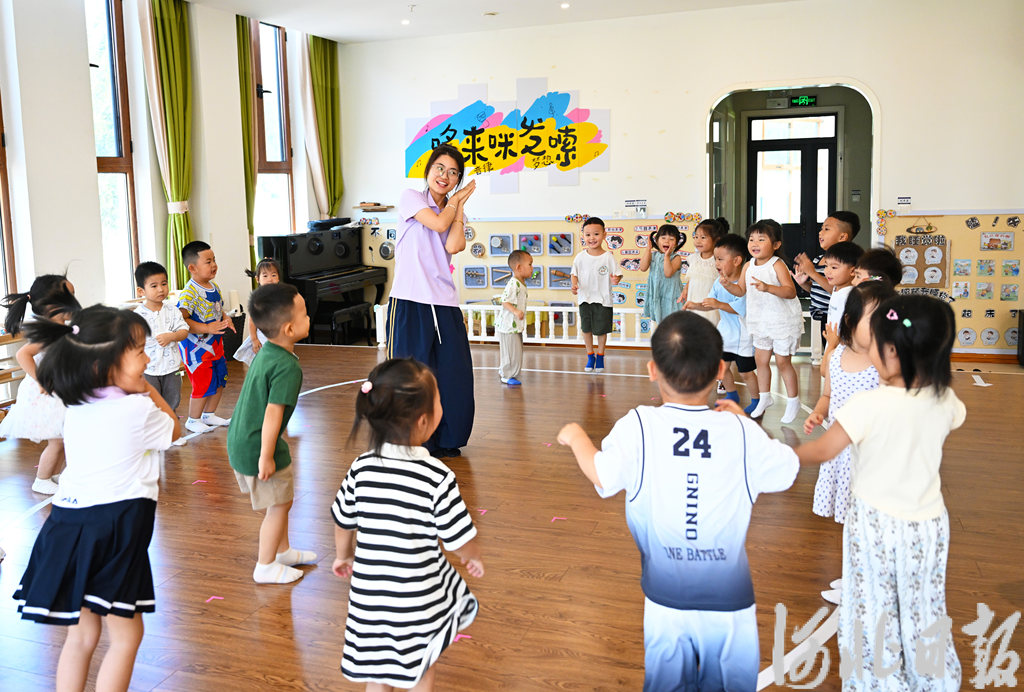 7月4日,邢台市南和区小博士第三幼儿园托育班,保育师带领孩子们做游戏。河北日报记者赵永辉摄