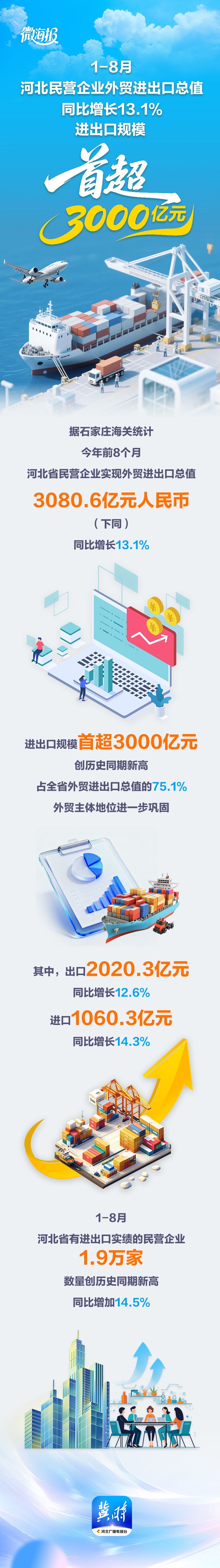 微海报丨1-8月,河北民营企业外贸进出口总值同比增长13.1% 进出口规模首超3000亿元