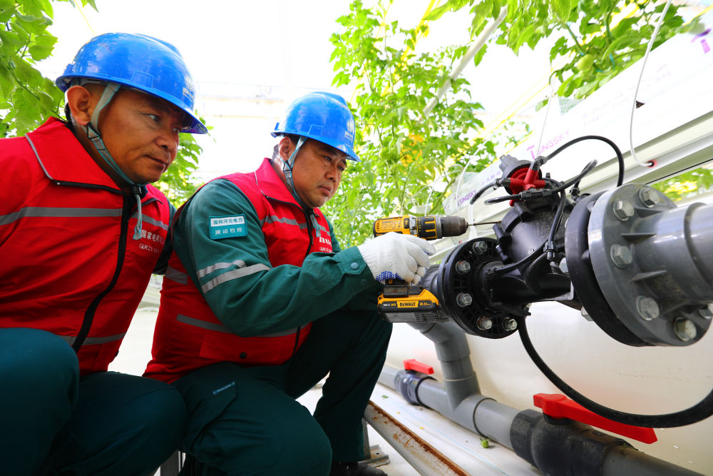 河北省电力工人在蔬菜大棚里查看用电设备运行情况。新华社记者王昆 摄
