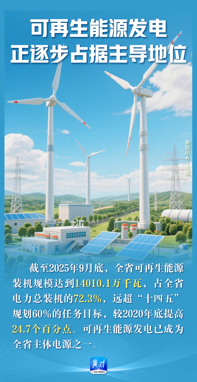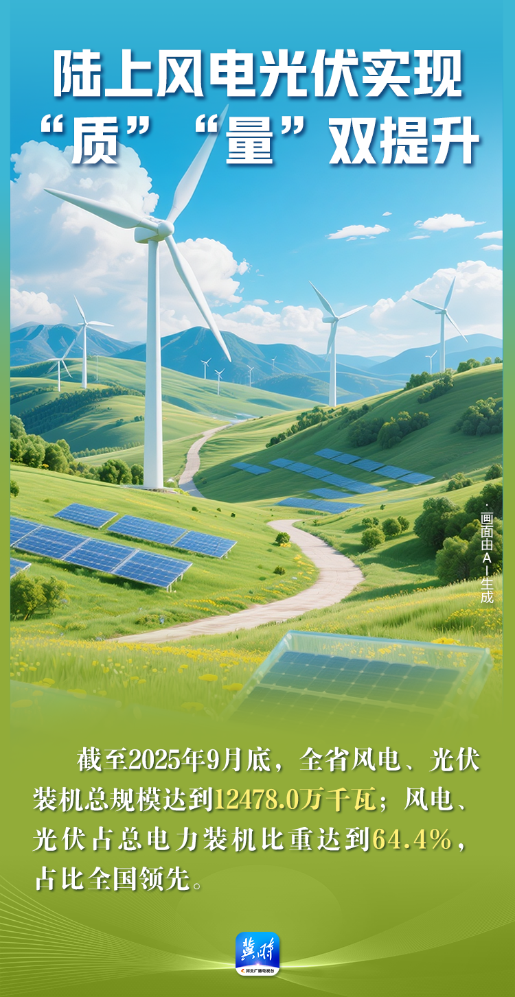 当转动叶片的“大风车”成为张北坝上的风景线,当铺满山坡的光伏板在阳光下熠熠生辉……河北这个传统资源大省、能源消耗大省,“十四五”期间以“稳稳的绿电”为笔,勾勒出了全面绿色转型的新画卷。