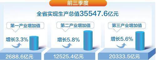 根据地区生产总值统一核算结果,前三季度,全省实现生产总值35547.6亿元,按不变价格计算,同比增长5.5%。分产业看,第一产业增加值2688.6亿元,增长3.3%;第二产业增加值12525.4亿元,增长5.8%;第三产业增加值20333.5亿元,增长5.6%。