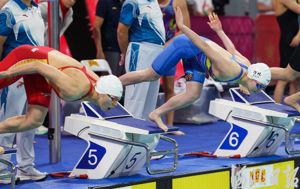 11月10日,河北选手李冰洁(右)在接力赛中。当日,中华人民共和国第十五届运动会游泳比赛在深圳大运中心游泳馆举行。在女子4×100米自由泳接力决赛中,由李冰洁、刘子璇、于子迪、赵静蕾组成的河北队获得铜牌。 河北日报记者 耿辉摄