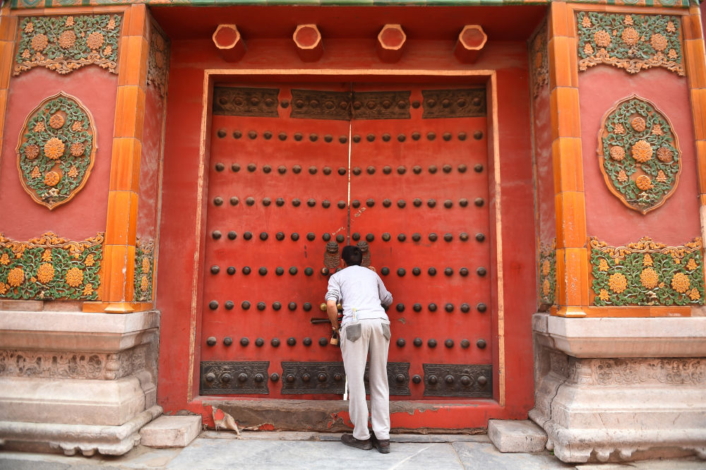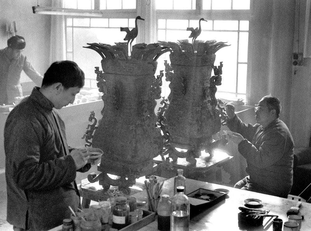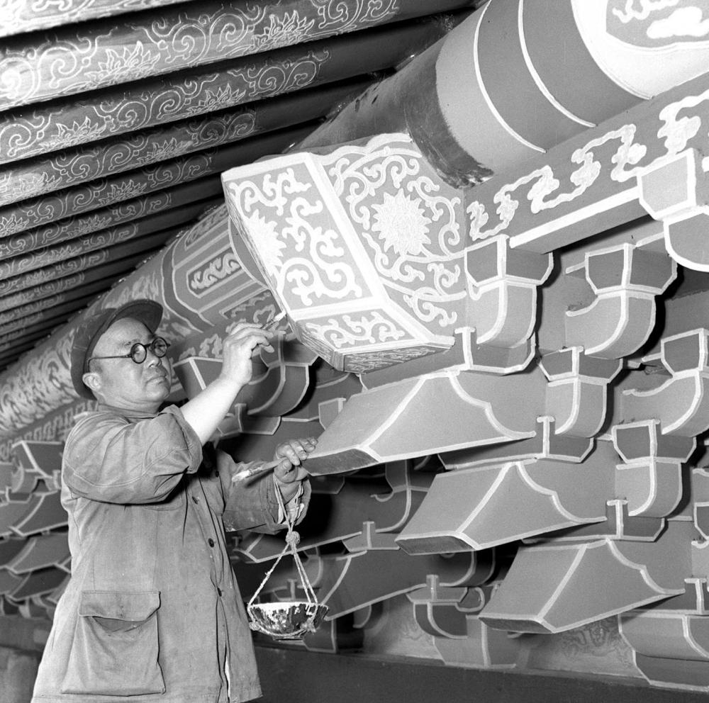 20世纪50年代/老彩画工张玉泉修整彩画/摄影:喻惠如