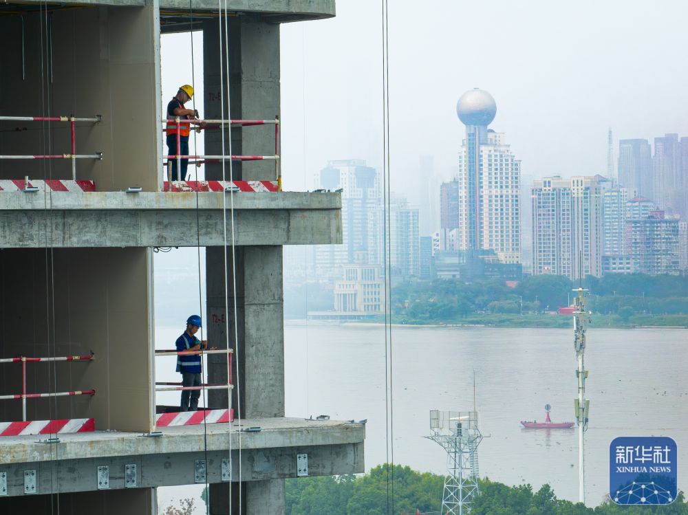 ↑ 10月1日,中建三局三公司工人在位于湖北省武汉市武昌区一处项目工地进行施工作业(无人机照片)。新华社记者 肖艺九 摄