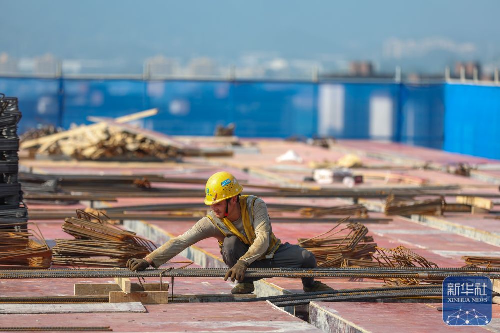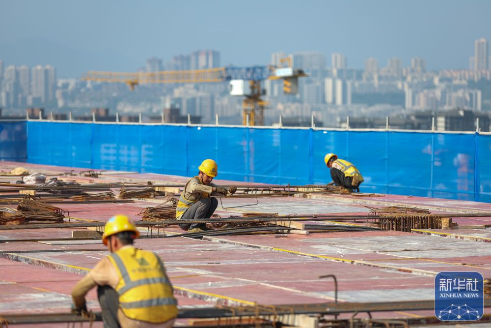 ↑ 10月1日,在重庆市两江新区,中建八局的施工人员在两江新区礼嘉创新中心项目进行绑钢筋作业。新华社记者 黄伟 摄