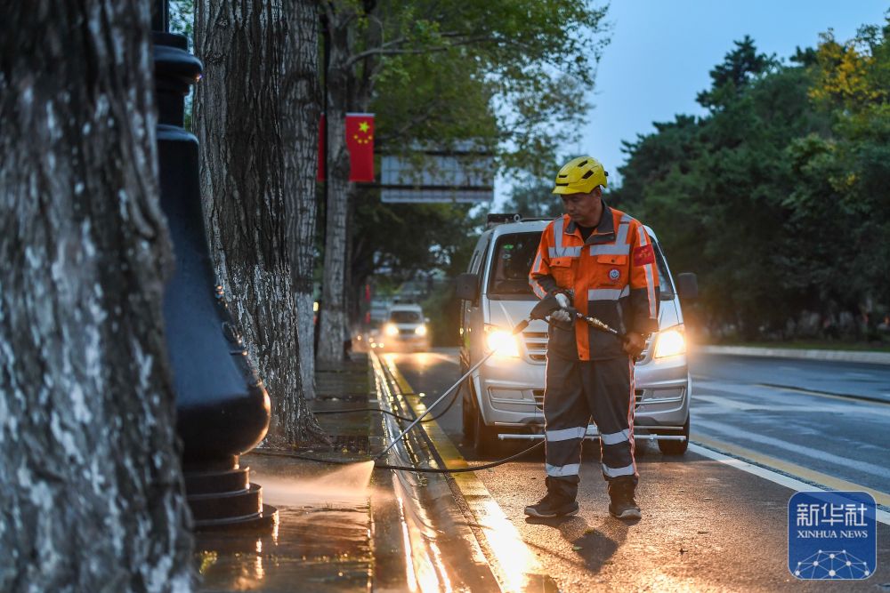 ↑ 10月1日,环卫工人在吉林省长春市朝阳区新民大街清扫人行步道。新华社记者 张楠 摄