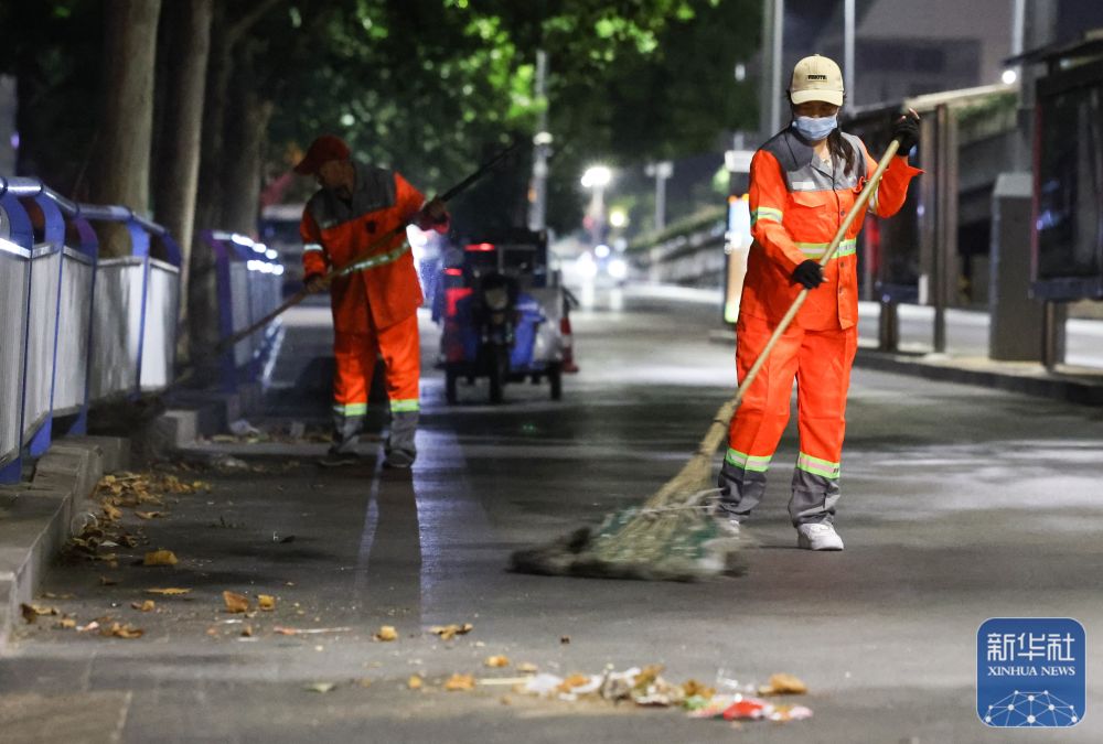 ↑ 10月1日,河北省石家庄市新华区环卫工人在中华大街进行道路晨扫工作。新华社发(梁子栋摄)