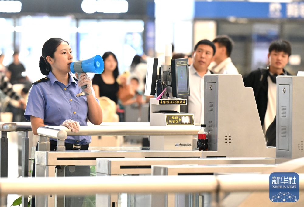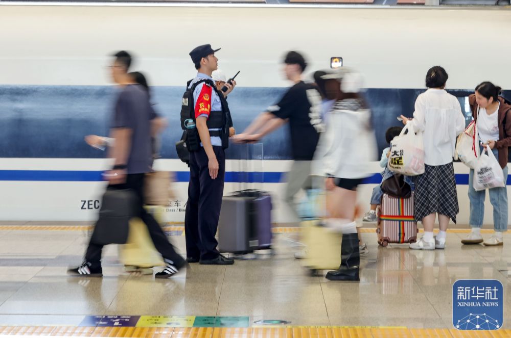 ↑ 10月1日,武汉铁路公安处武汉站派出所民警在武汉站巡查。新华社发(赵军摄)
