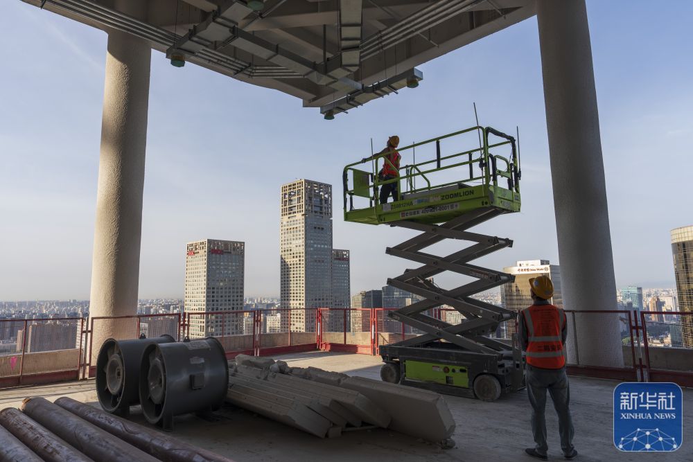 ↑ 10月1日,在北京CBD核心区Z3项目上,中建二局安装工程有限公司机电安装工人在施工。新华社记者 才扬 摄