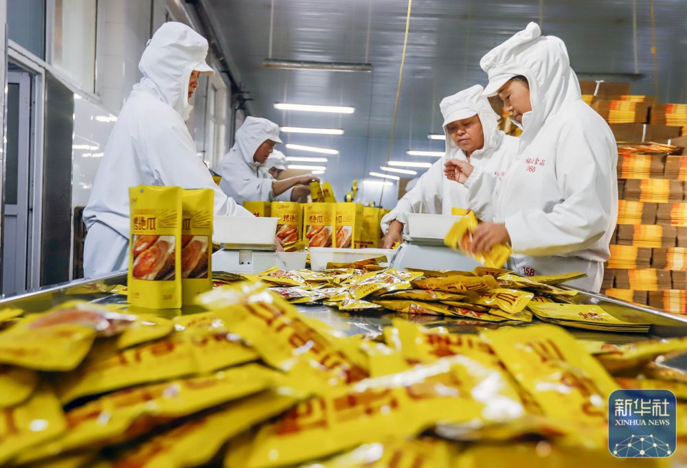 ↑ 10月1日,工人在河北省遵化市苏家洼镇一家食品加工企业包装车间工作。新华社发(刘满仓摄)