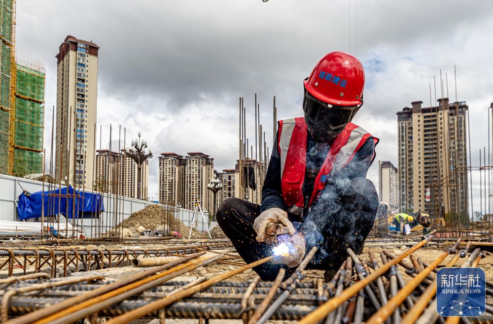 ↑ 10月1日,工人在贵州省黔西市一建筑工地进行钢筋焊接作业。新华社发(范晖摄)