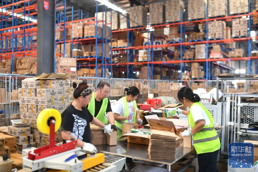 ↑ 10月1日,山东省青岛市城阳区夏庄街道青岛鲜美鲜到供应链管理有限公司仓库拣货员在拣选货物。新华社发(王海滨摄)
