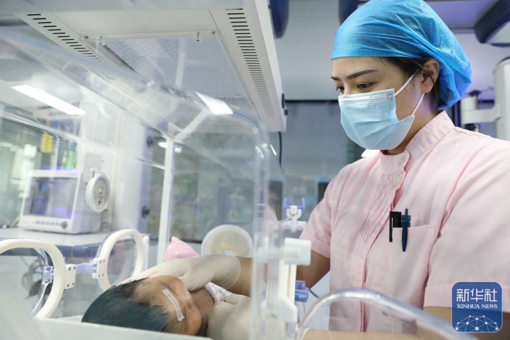 ↑ 10月1日,河南省焦作市温县妇幼保健院护士在给新生儿做护理。新华社发(徐宏星摄)