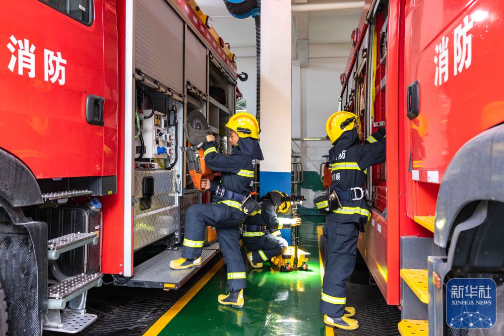↑ 10月1日,贵州省安顺经济技术开发区消防救援大队消防救援人员在检查装备。新华社发(陈熙摄)