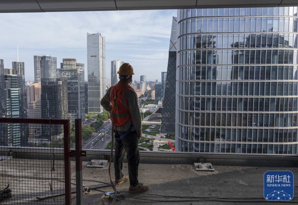 ↑ 10月1日,在北京CBD核心区Z3项目上,玻璃幕墙安装工人在施工间歇观赏城市景色。新华社记者 才扬 摄