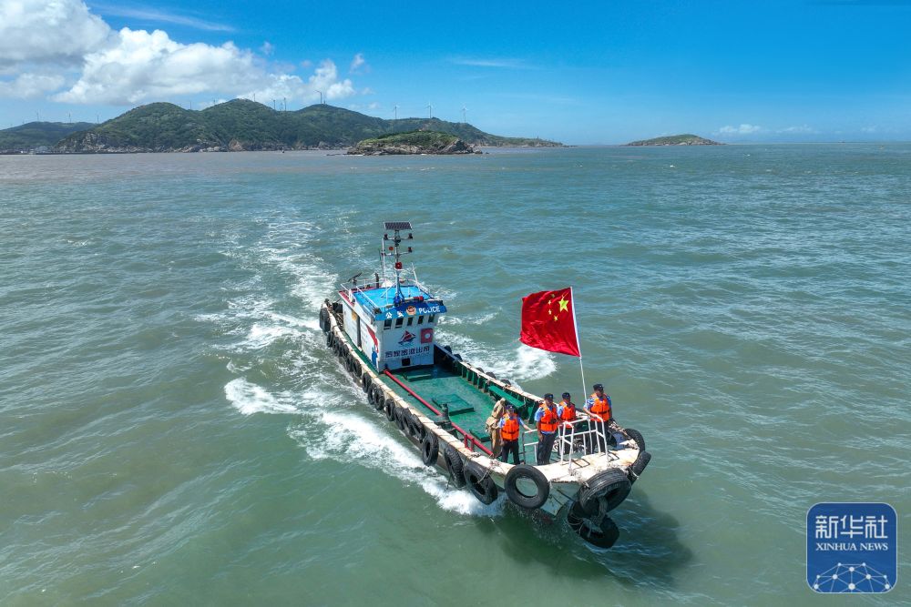 ↑ 10月1日,浙江省舟山市岱山县公安局罗家岙派出所民警开展海上巡查(无人机照片)。新华社发(邹训永摄)