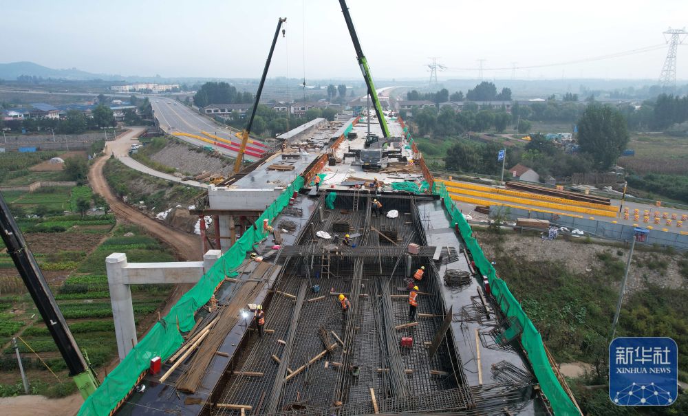 ↑ 10月1日,在河北省石家庄市井陉县的石太高速改扩建项目甘陶河大桥施工现场,工人进行桥梁施工作业。新华社发(张晓峰摄)