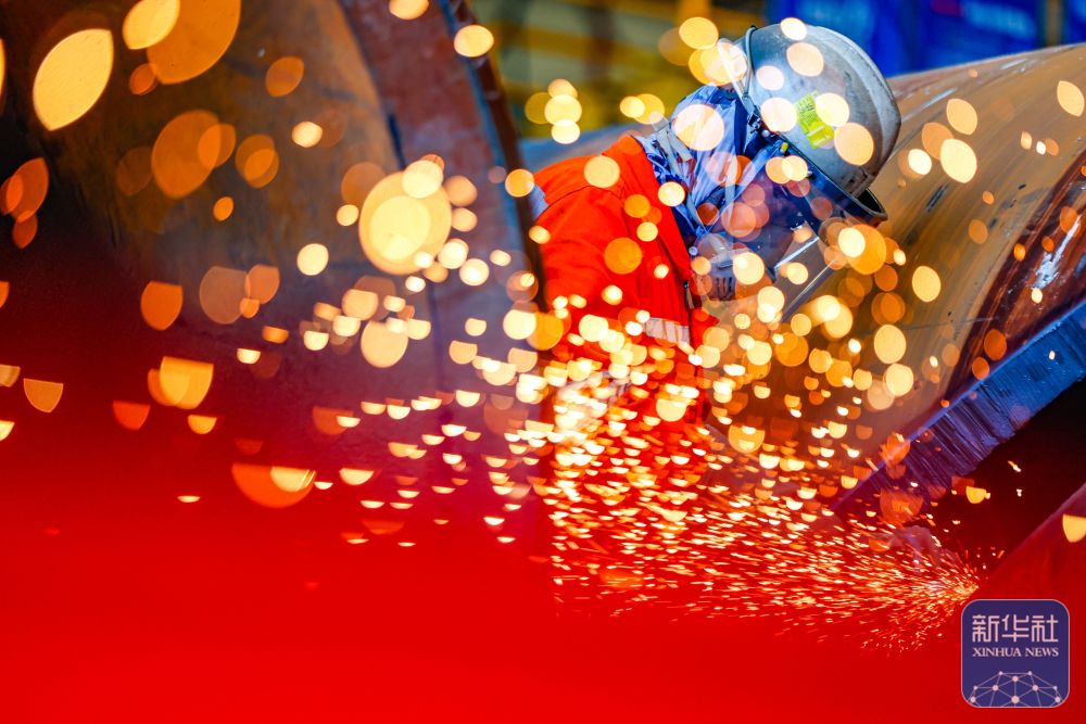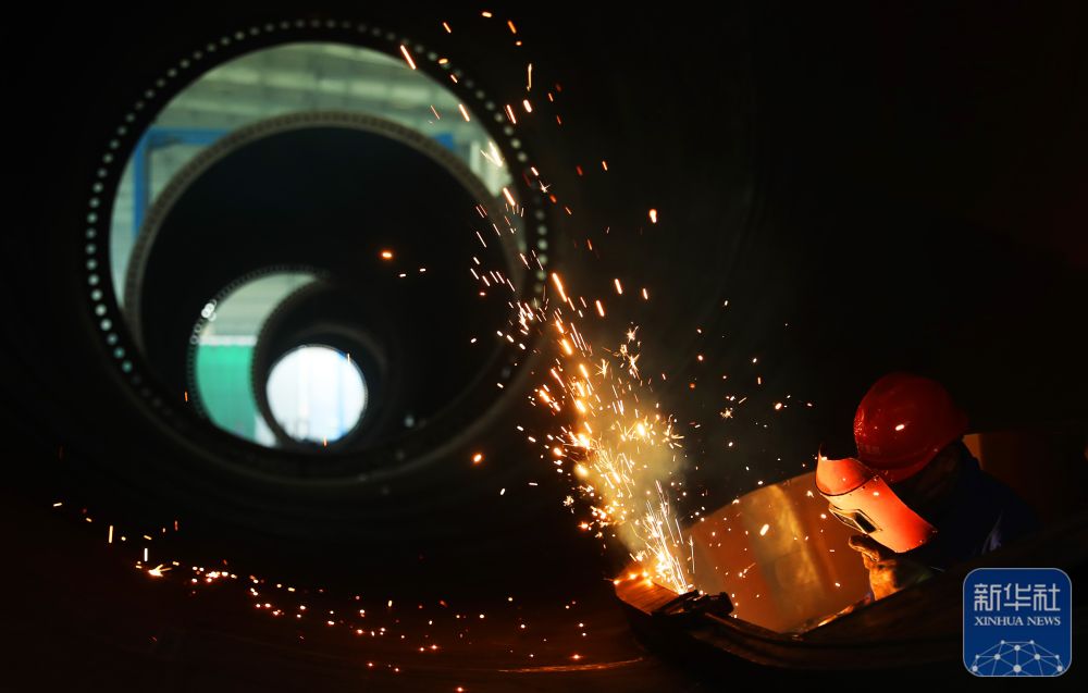 ↑ 10月1日,在湖南省衡阳市衡山县经济开发区,恒岳重钢钢结构工程有限公司员工进行风电塔筒的部件加工作业。新华社发(曹正平摄)