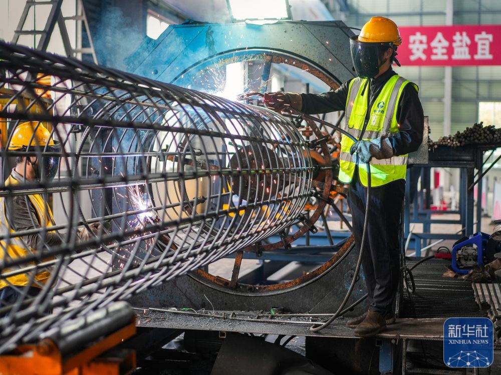 ↑ 10月1日,工人在位于江苏省兴化市陈堡镇的中铁上海工程局盐宜铁路项目部钢筋加工场进行焊接作业。新华社发(周社根摄)
