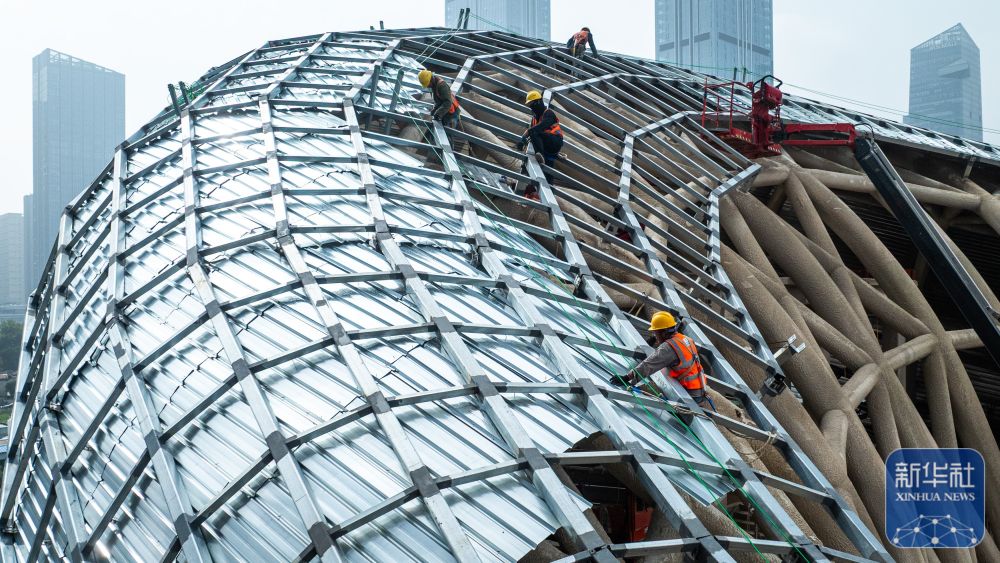 ↑ 10月1日,工人在江苏省泰州市高铁南站综合交通枢纽一项目为井字架安装防护网(无人机照片)。新华社发(顾继红摄)