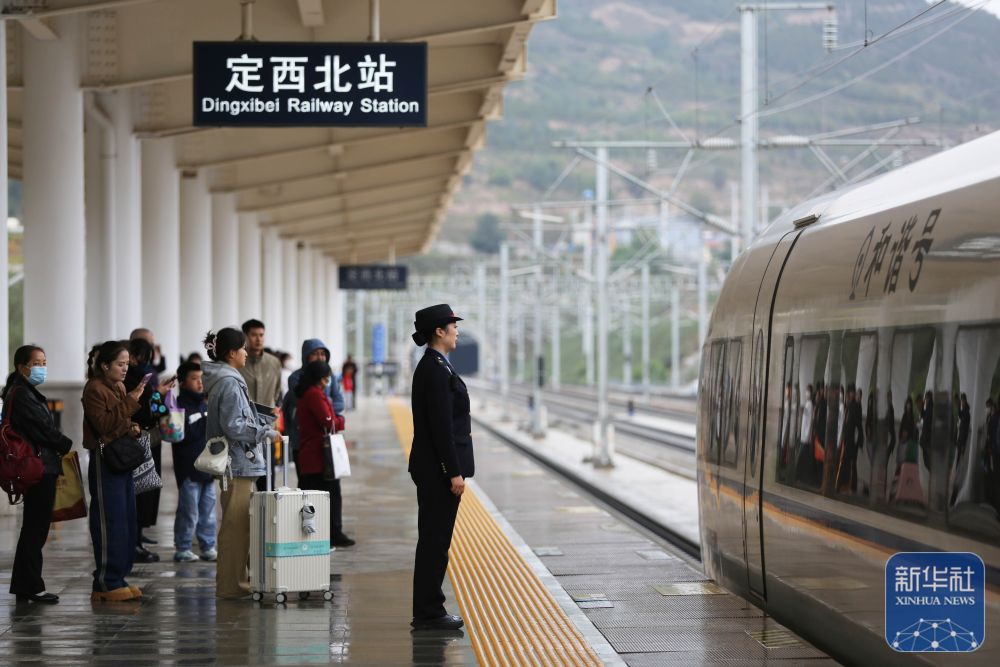 ↑ 10月1日,宝兰高铁甘肃定西北站工作人员在站台上接车。新华社发(王克贤摄)