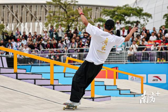 11月11日下午,十五运会滑板项目男子街式决赛,广东队潘家杰完成高难度动作后展开双臂与欢呼的观众们互动。郑新洽 摄