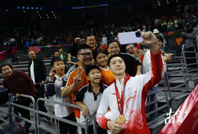 11月12日,十五运会男篮成年组决赛,广东队获得冠军后,胡明轩与球迷们合影留念。张由琼 摄