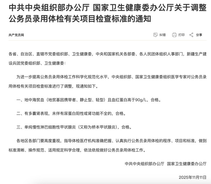 近日,《中共中央组织部办公厅 国家卫生健康委办公厅关于调整公务员录用体检有关项目检查标准的通知》(以下简称《通知》)发布,经过此次调整,地中海贫血(地贫基因携带者、静止型、轻型)且血红蛋白高于90g/L即为合格。同步调整的还有:有多囊肾表现,未伴有尿蛋白阳性或肾功能不全的,合格;单纯慢性淋巴细胞性甲状腺炎(又称为桥本甲状腺炎),合格。