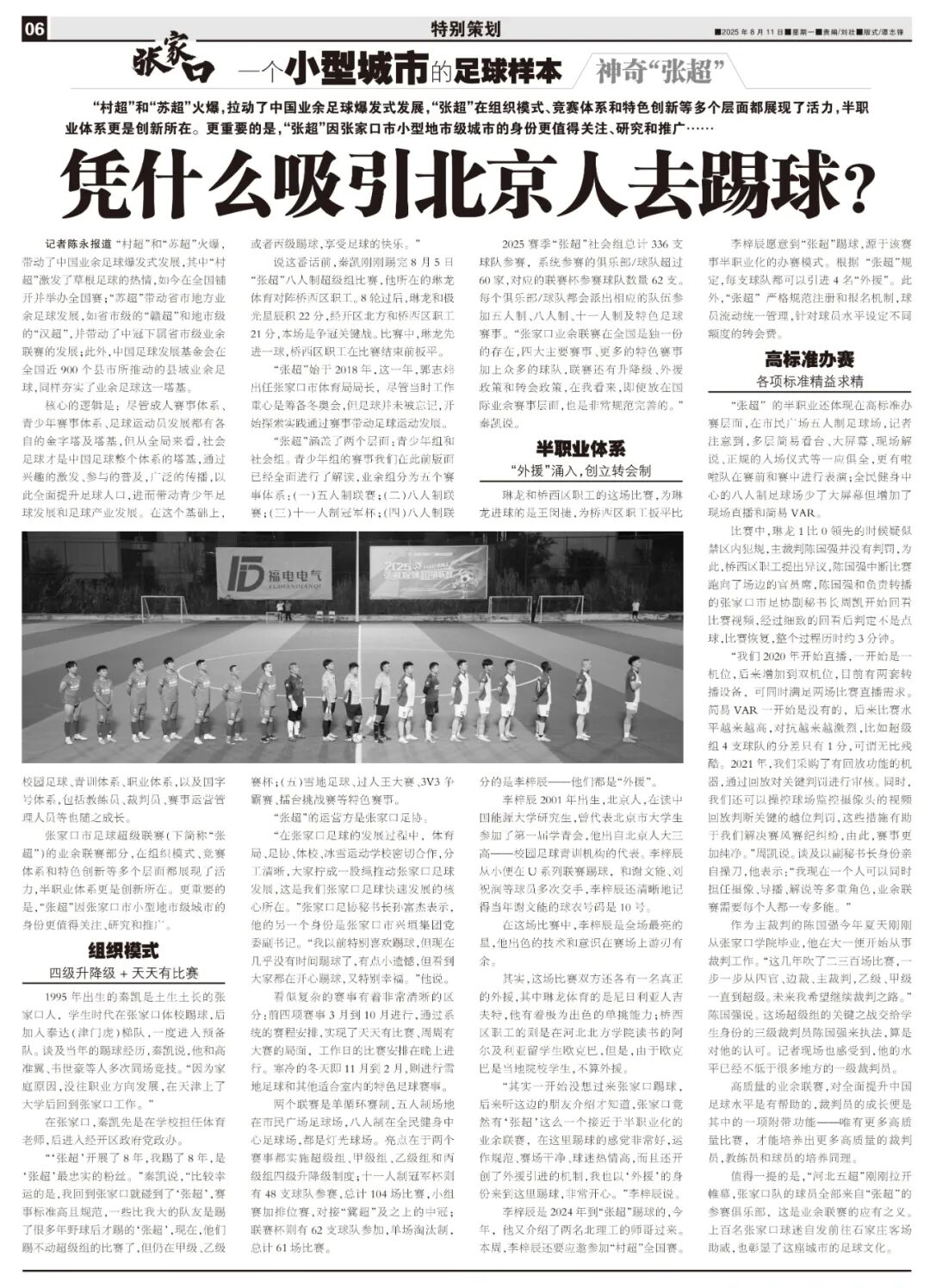 张家口市足球超级联赛(下简称“张超”)的业余联赛部分,在组织模式、竞赛体系和特色创新等多个层面都展现了活力,半职业体系更是创新所在。更重要的是,“张超”因张家口市小型地市级城市的身份更值得关注、研究和推广。