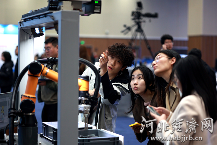 与会人员在梅卡曼德(雄安)机器人科技股份有限公司展台前,了解配备了高精度工业3D相机的机器人。河北经济日报记者 袁立朋 摄