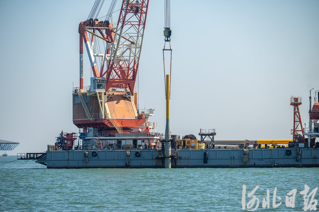 “运桩船已完成靠泊,准备打桩。”9时30分,项目现场调度王树松的指令通过对讲机发出。不远处,一艘打桩船的巨型吊臂正将约15吨重的钢桩缓缓吊起,阳光在桩身上流动,映出甲板上工人紧绷的侧脸。液压冲击锤轰鸣着将近30米长的钢桩钉入海底,每一次夯击都让打桩船船身轻微震颤,溅起朵朵浪花。