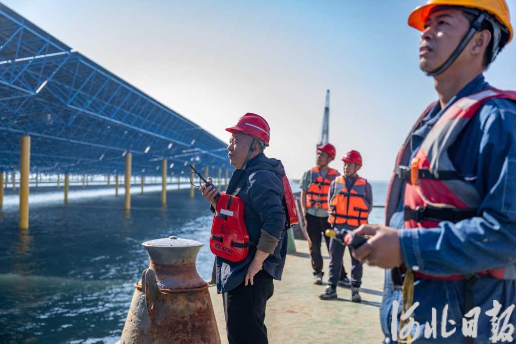 正午的阳光为光伏板镀上金边时,吊装作业进入关键窗口期。68米长、38.4米宽的光伏网架在“1主+4次”吊装设备牵引下升空,面积相当于6个标准篮球场的网架掠过海面,阴影在波峰浪谷间快速移动。“右边保持不动,左前抬高一些,左边再向前移。”施工指挥人员王久龙不断通过对讲机发出指令,吊塔司机根据指令转动控制杆,四根次吊装索链精准调整角度,将网架稳稳对接在4个不足0.2平方米的桩顶接口。