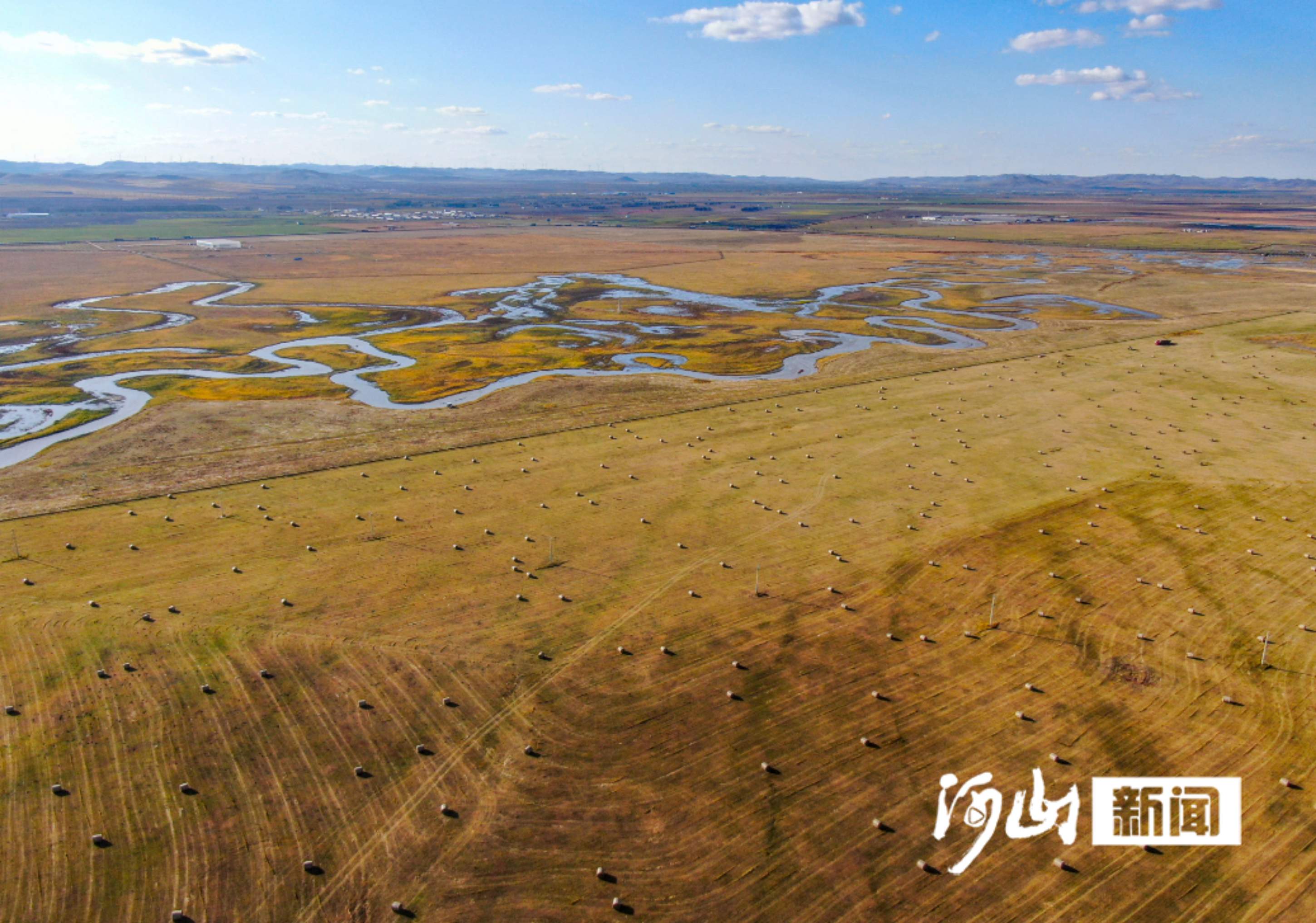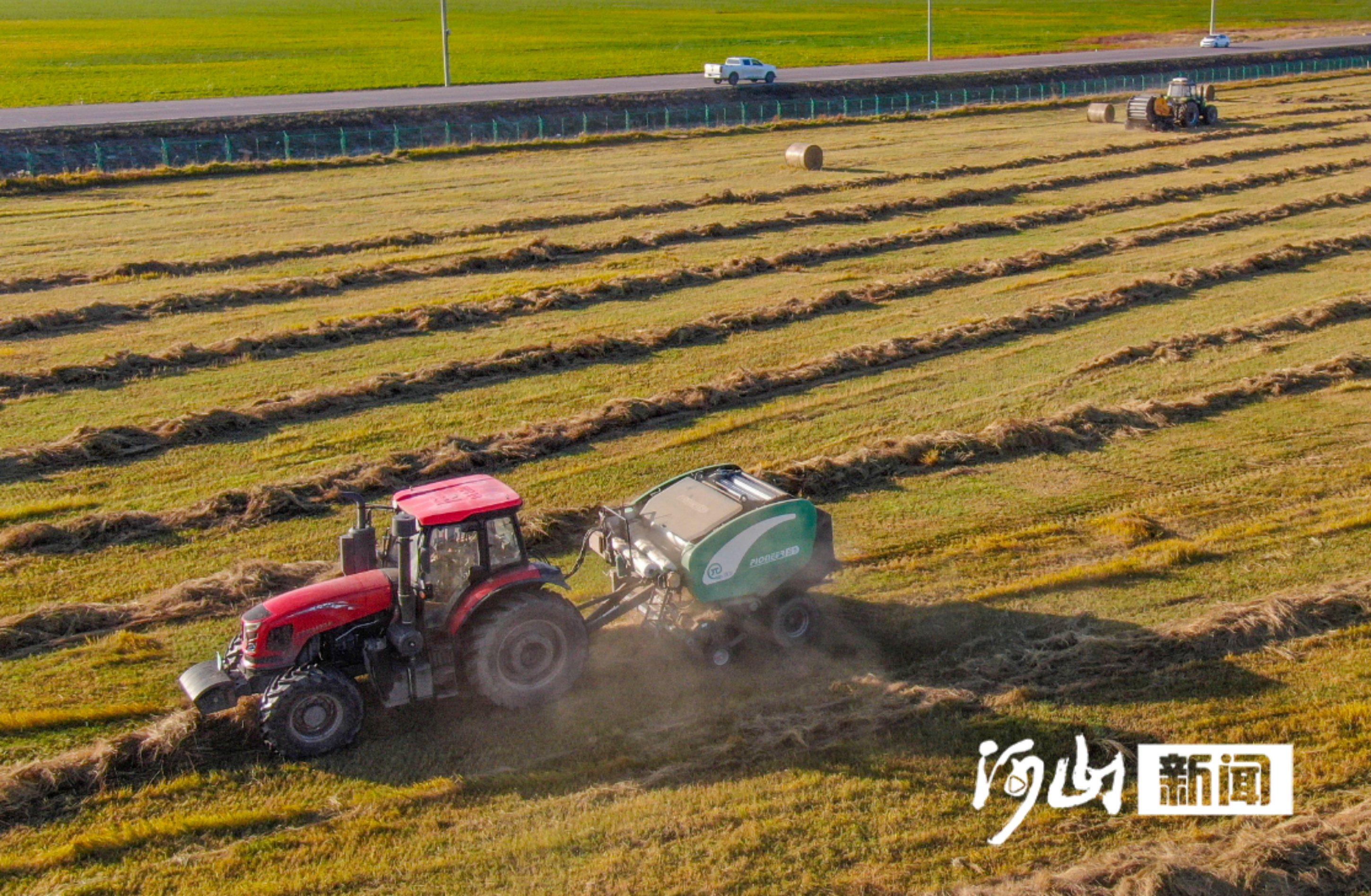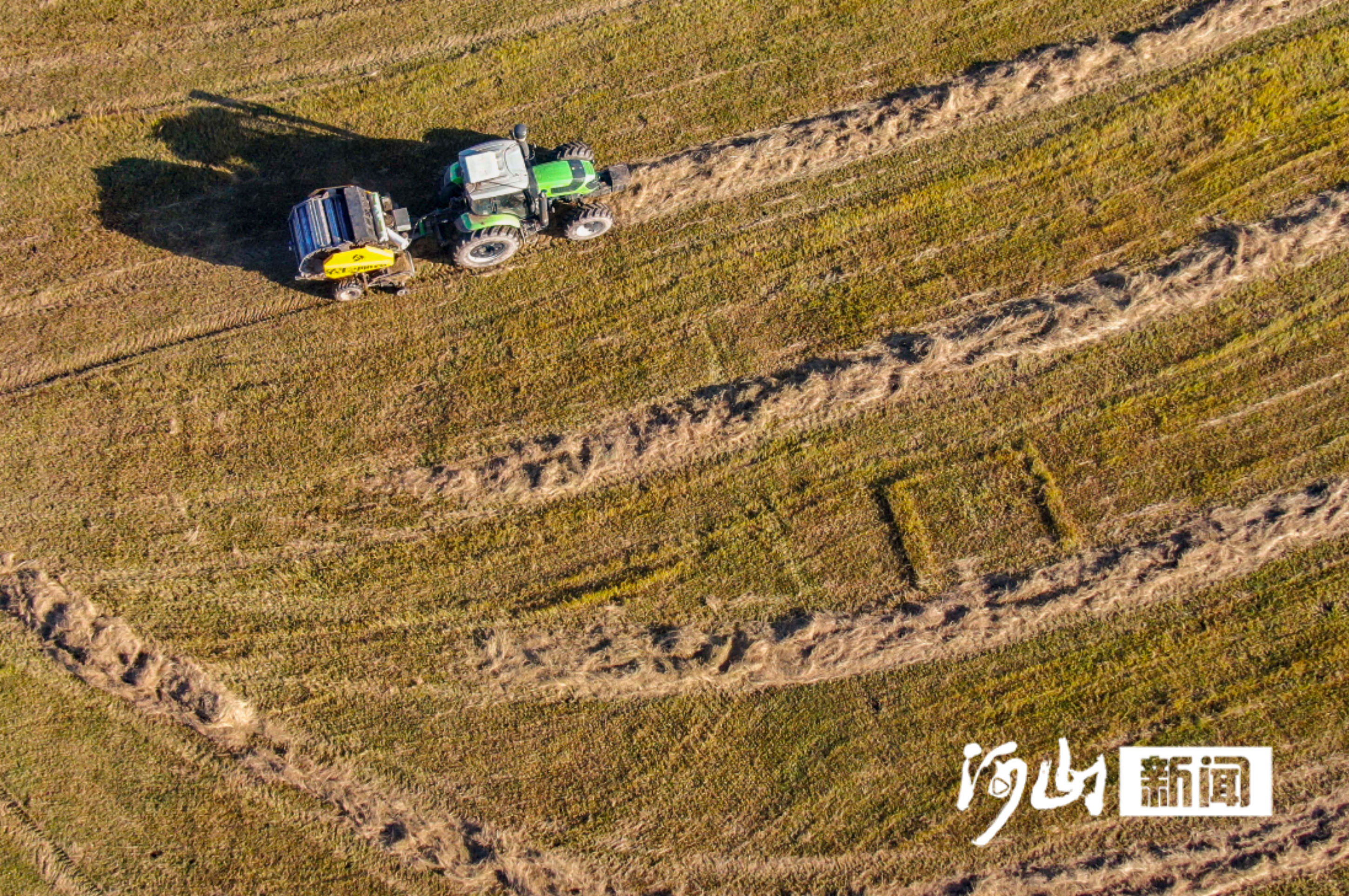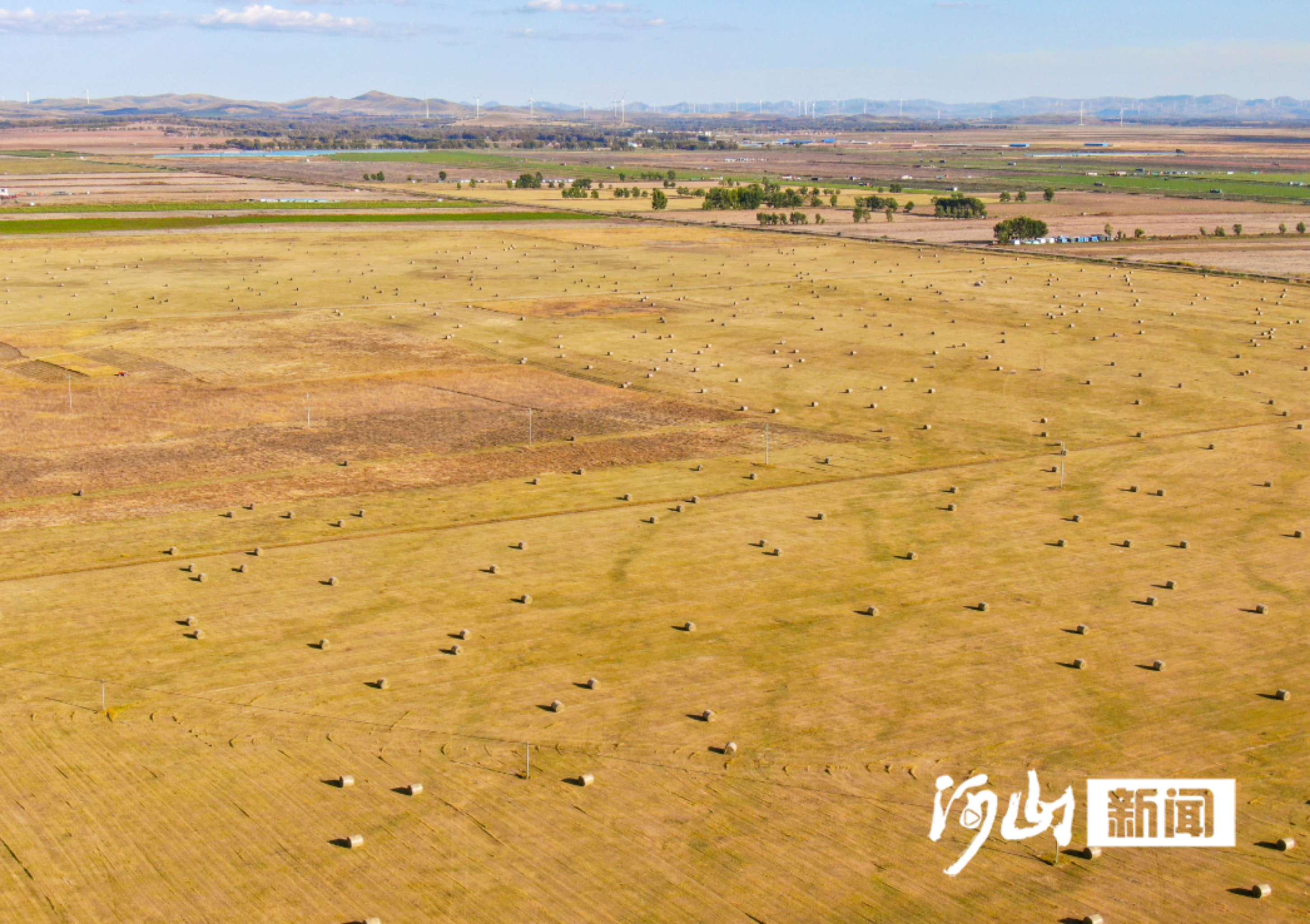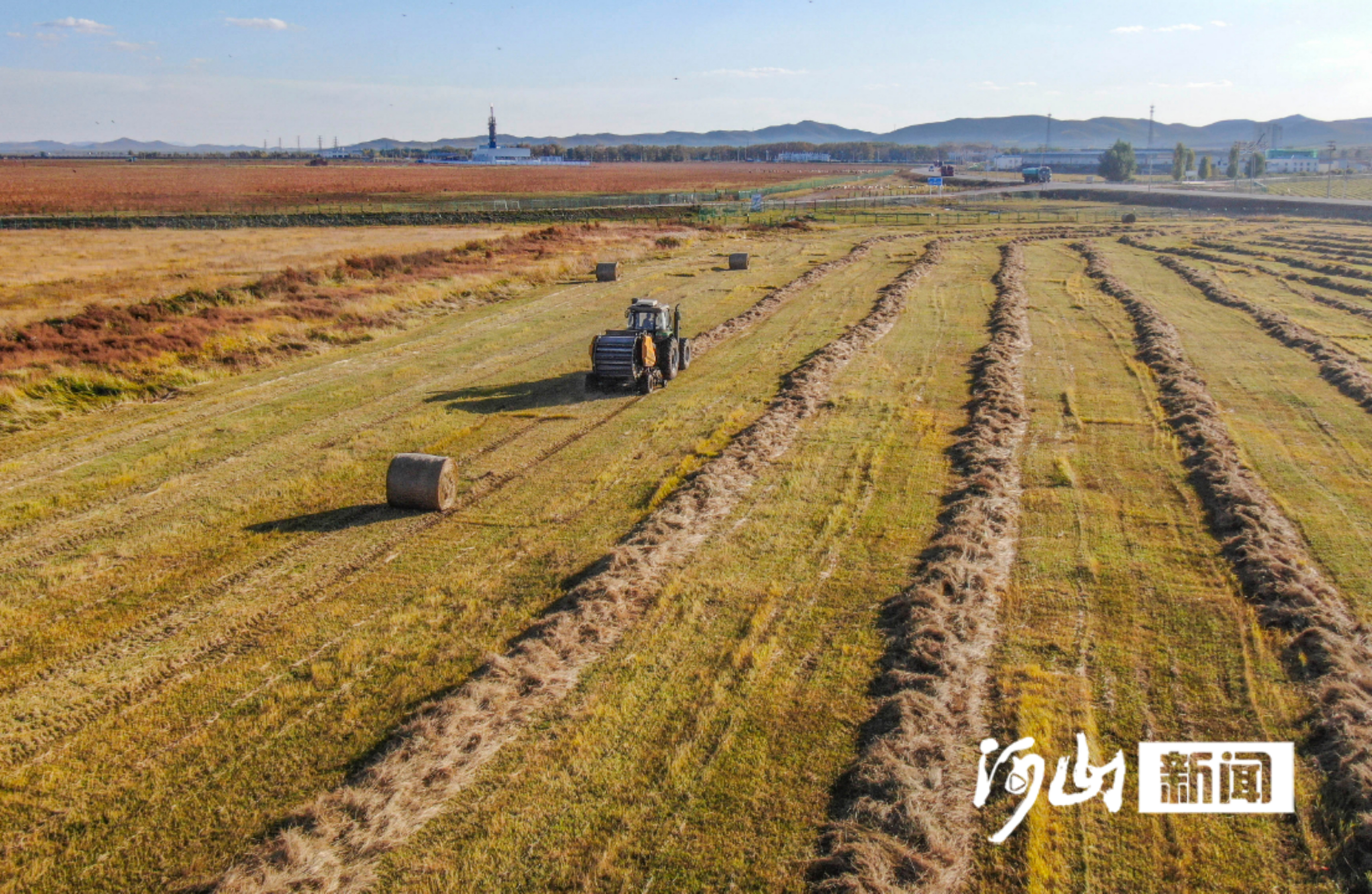 金秋十月,坝上草原的塞北管理区草场上,机械往来穿梭,牧草收割、打捆、运输的繁忙景象随处可见。